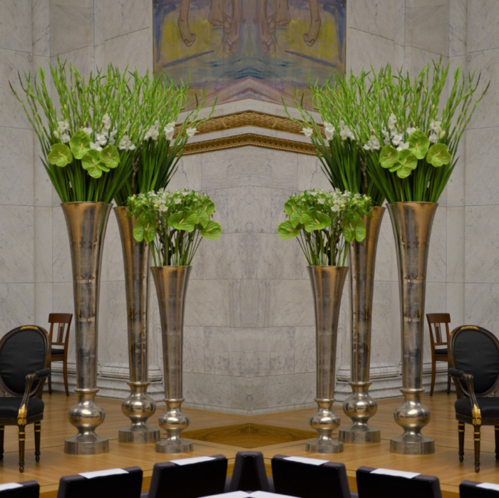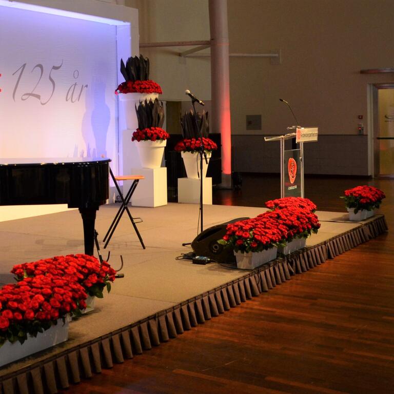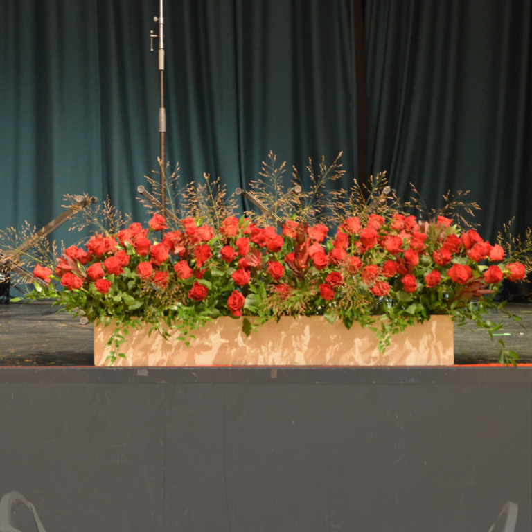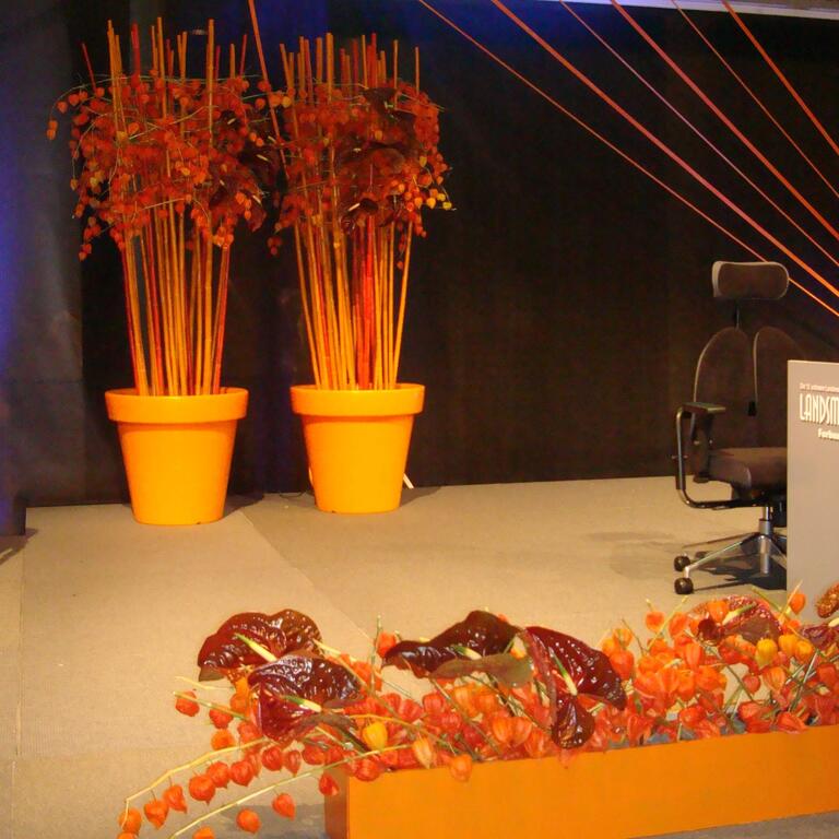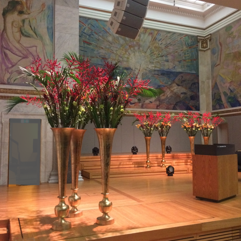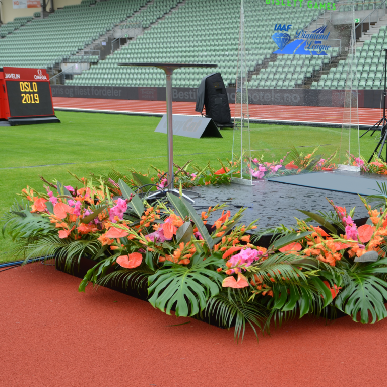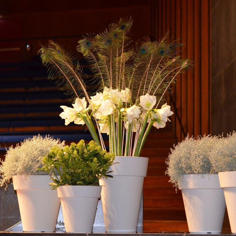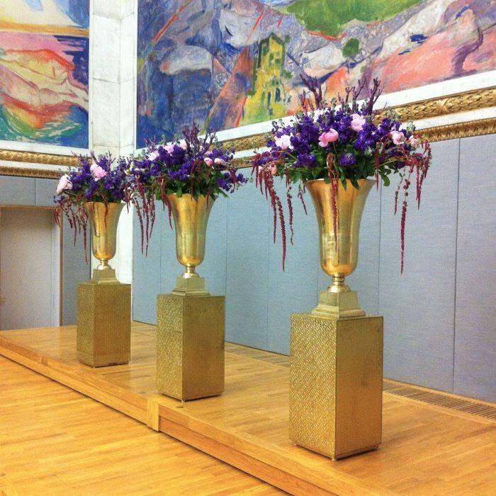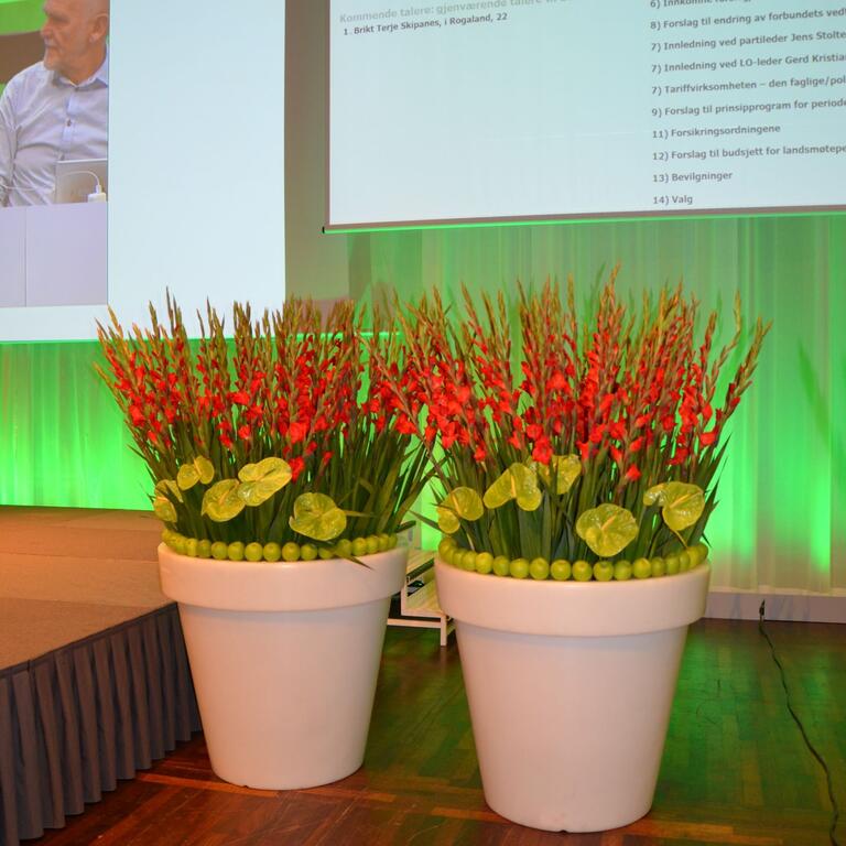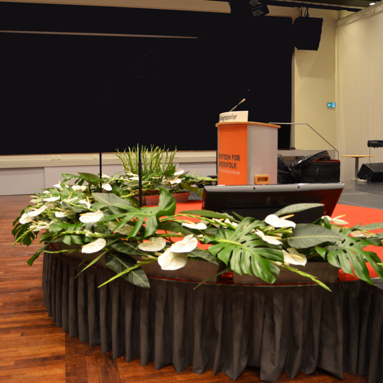 Det kan være fint å tenke på at ved bruk av en stor scene eller i et stort rom, trenger man større dekor for at blomstene skal stå i proporsjon med resten. Noen ganger kan det være bedre å lage en stor dekorasjon istedenfor to små. Dekorasjonene lager vi i en høyde som er godt synlige fra salen, men ikke skjuler de aktiviteter som foregår på scenen. Ønsker dere høyere dekor, tar vi med søyler å sette dekorasjonene på. Vi leier ut både potter og søyler som en del av vårt konsept.
