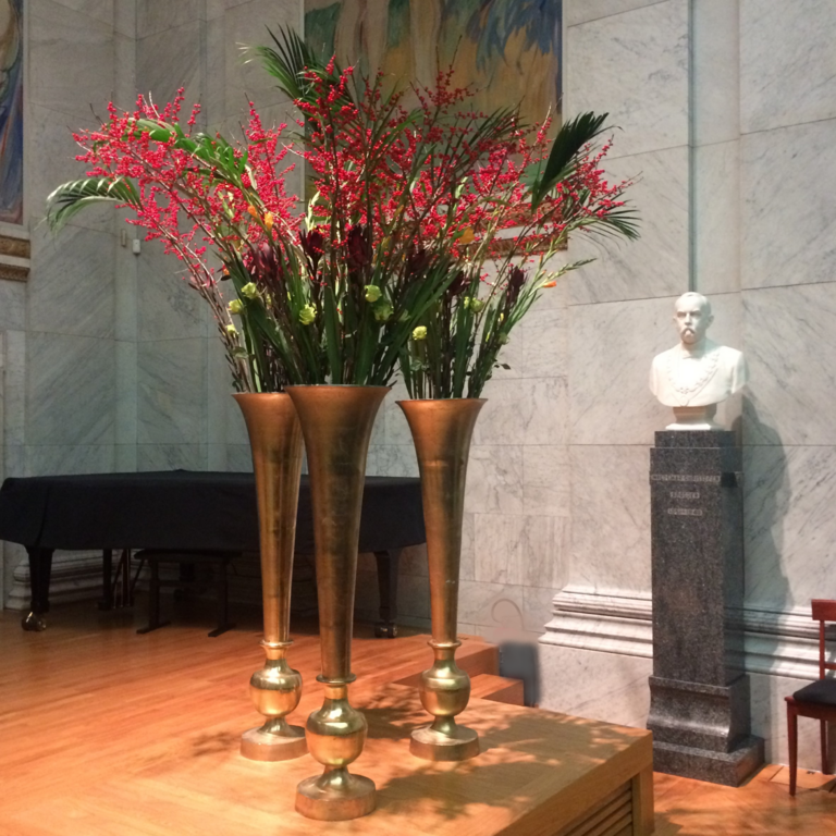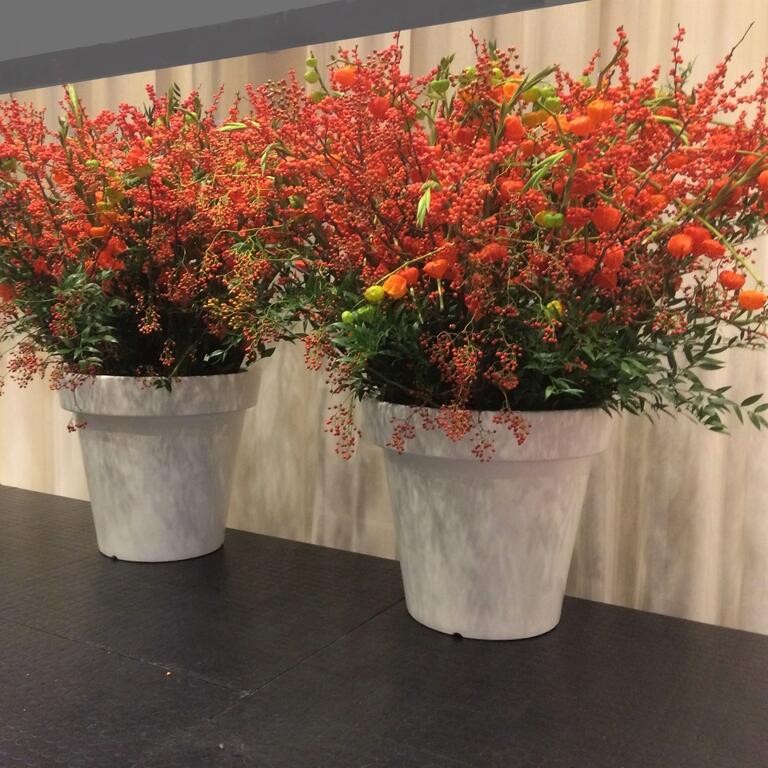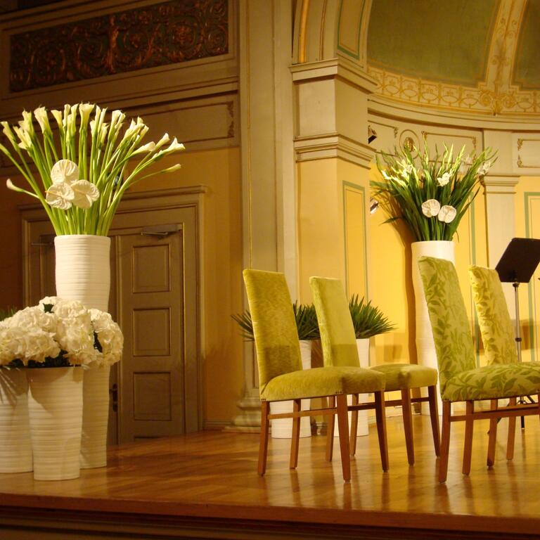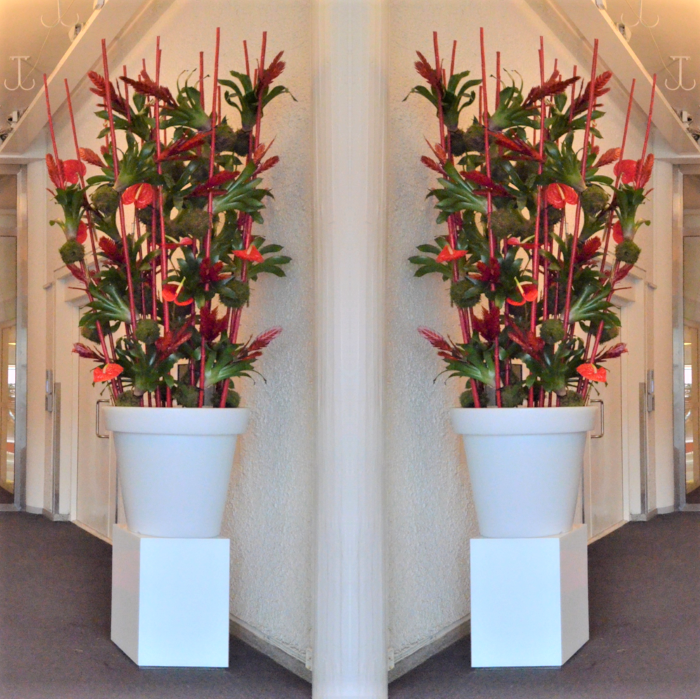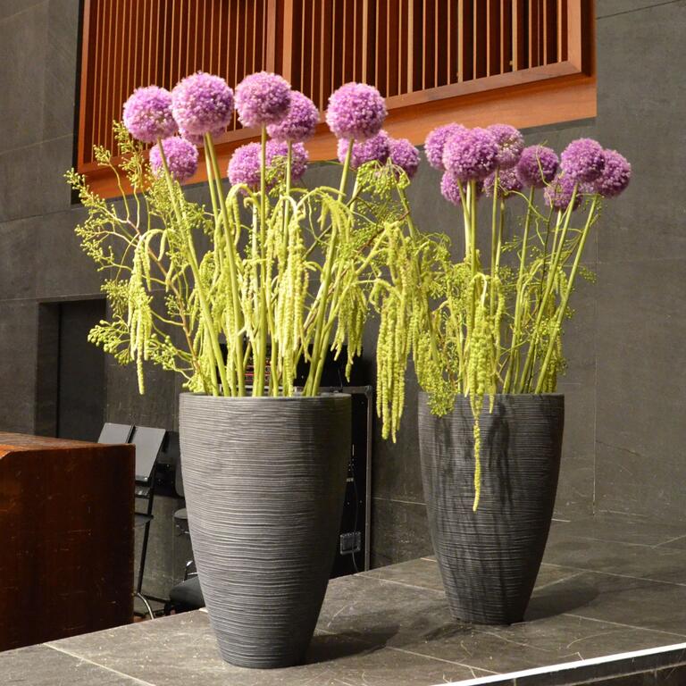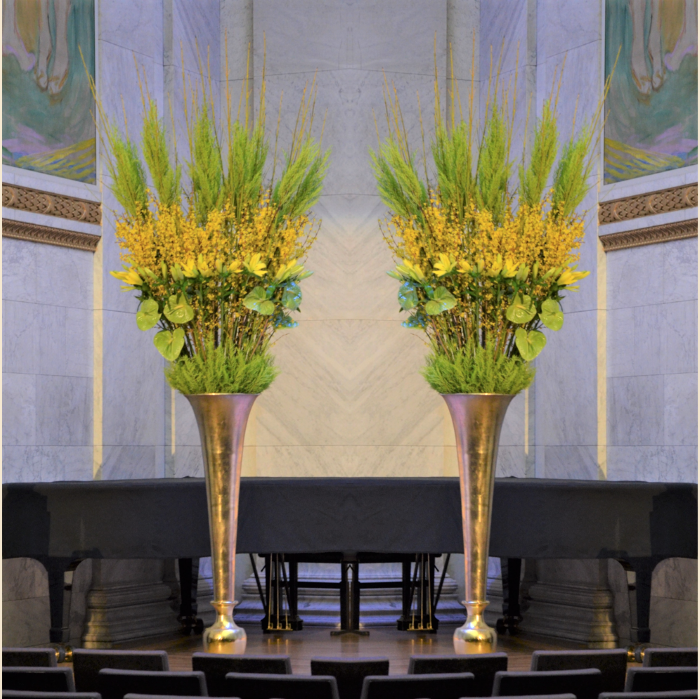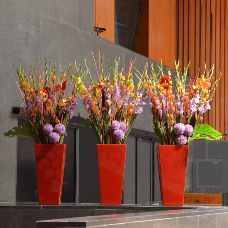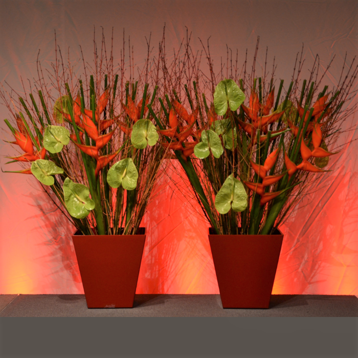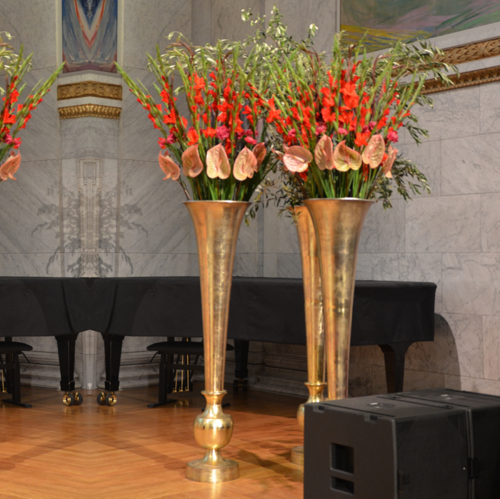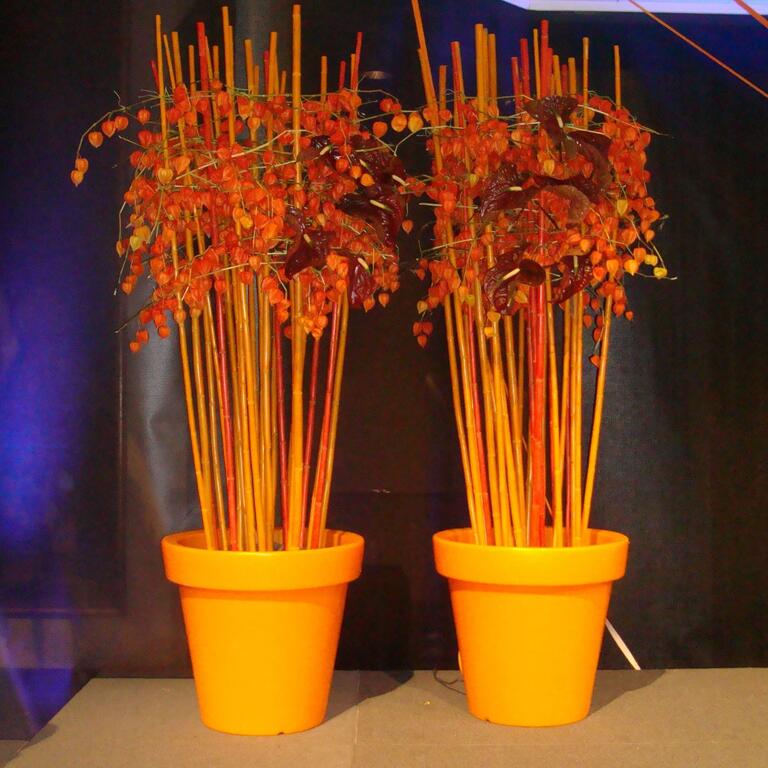 Det kan være fint å tenke på at ved bruk av en stor scene eller i et stort rom, trenger man større dekor for at blomstene skal stå i proporsjon med resten. Noen ganger kan det være bedre å lage en stor dekorasjon istedenfor to små. Dekorasjonene lager vi i en høyde som er godt synlige fra salen, men ikke skjuler de aktiviteter som foregår på scenen. Ønsker dere høyere dekor, tar vi med søyler å sette dekorasjonene på. Vi leier ut både potter og søyler som en del av vårt konsept.