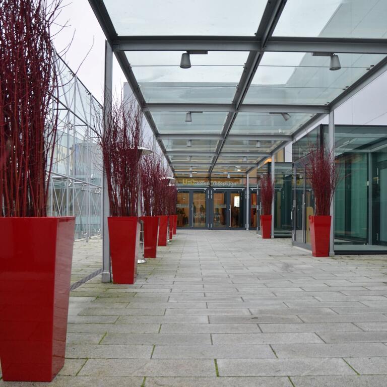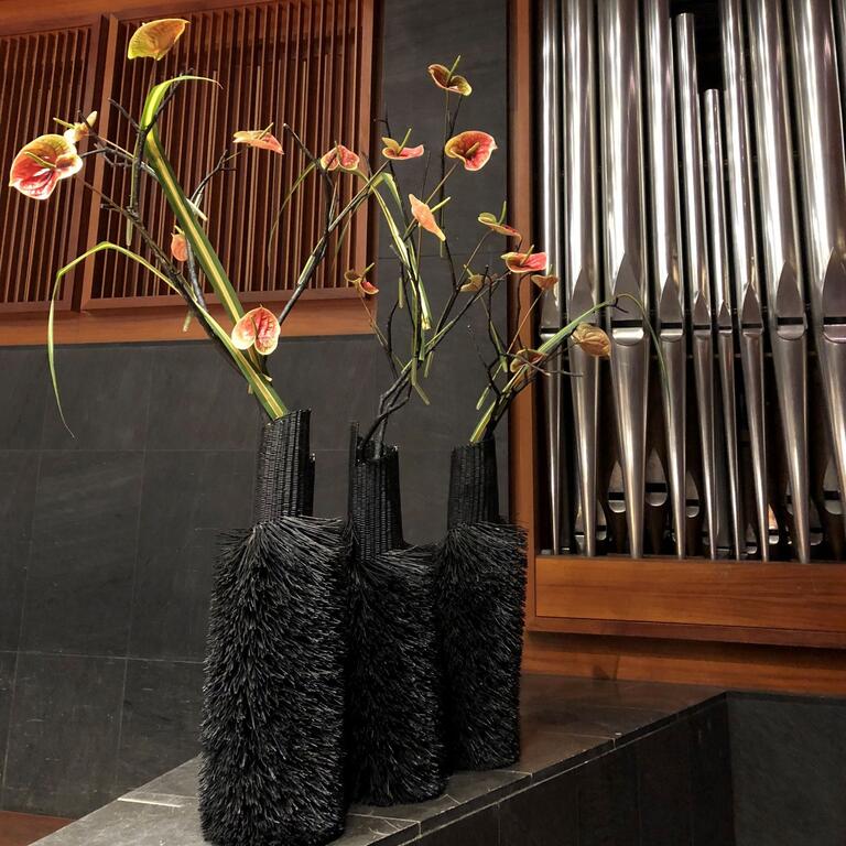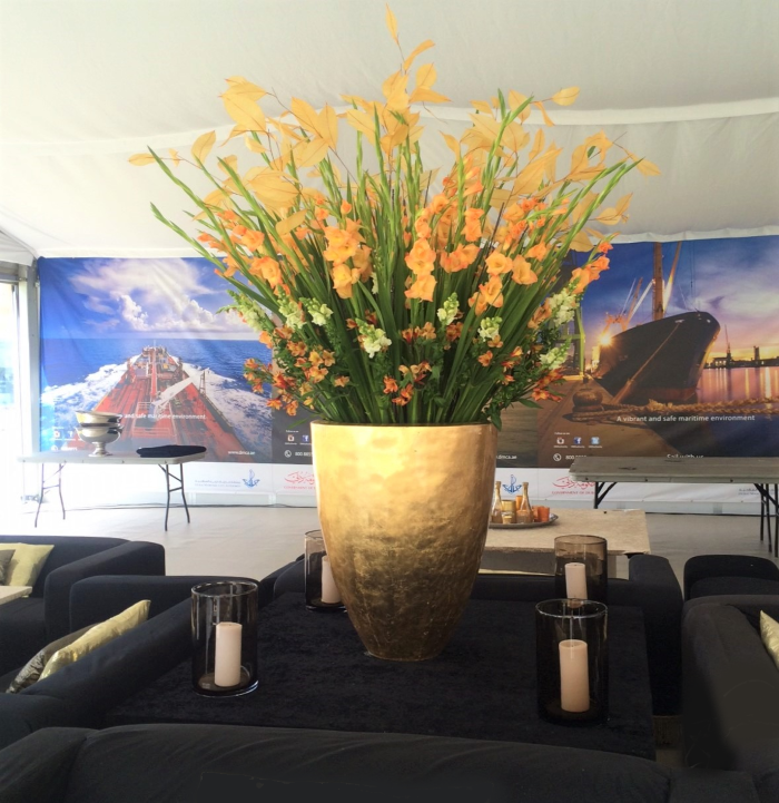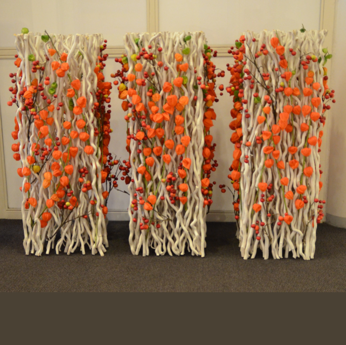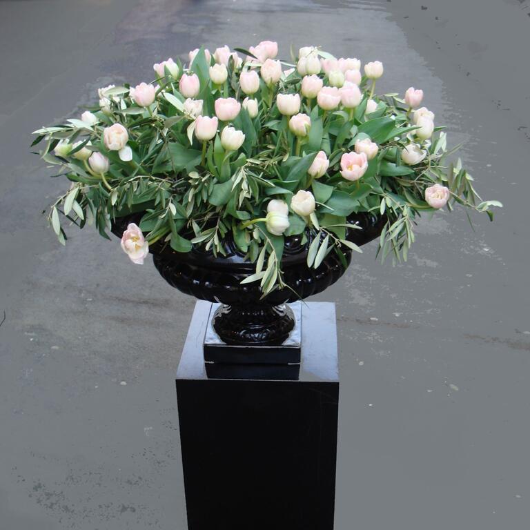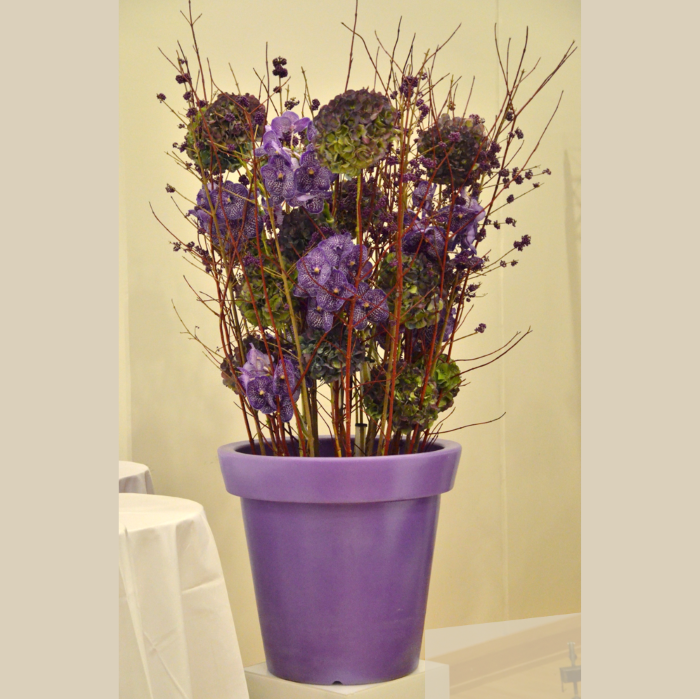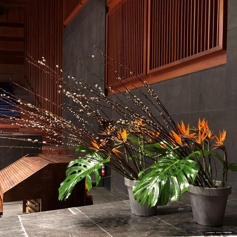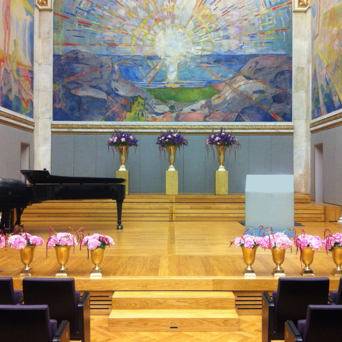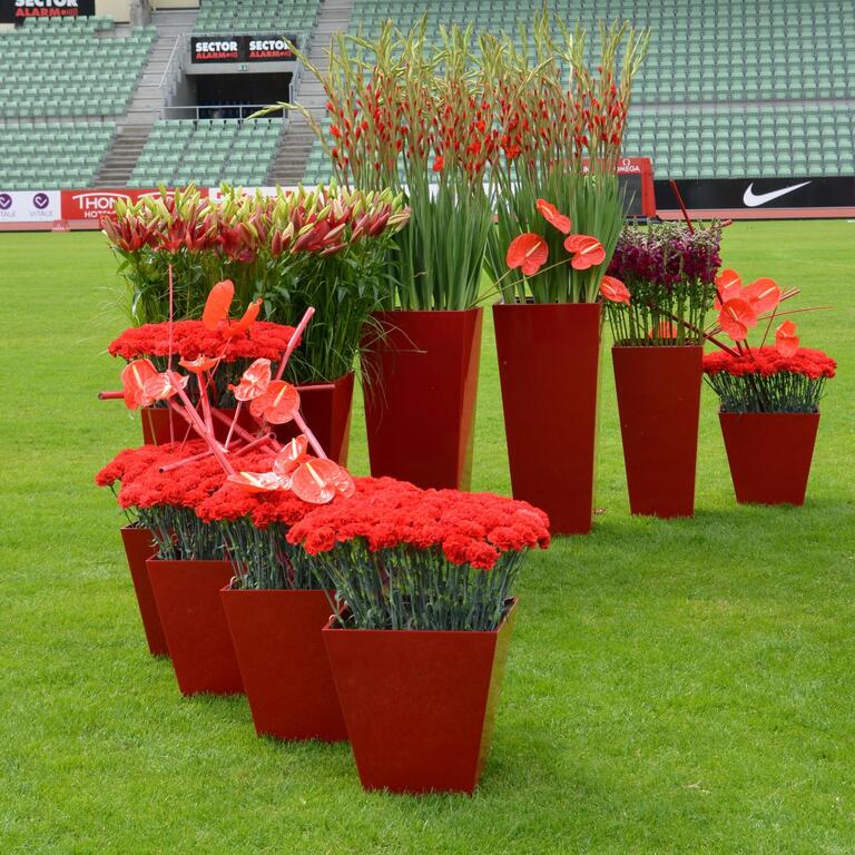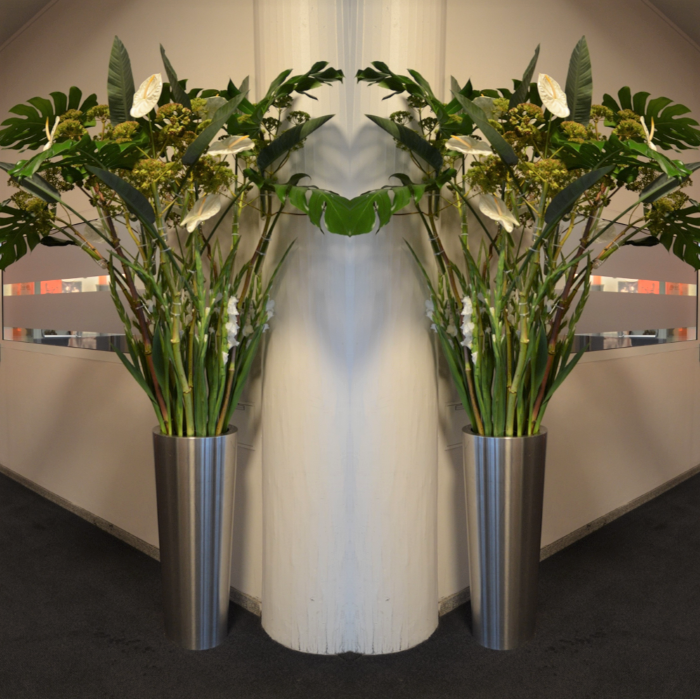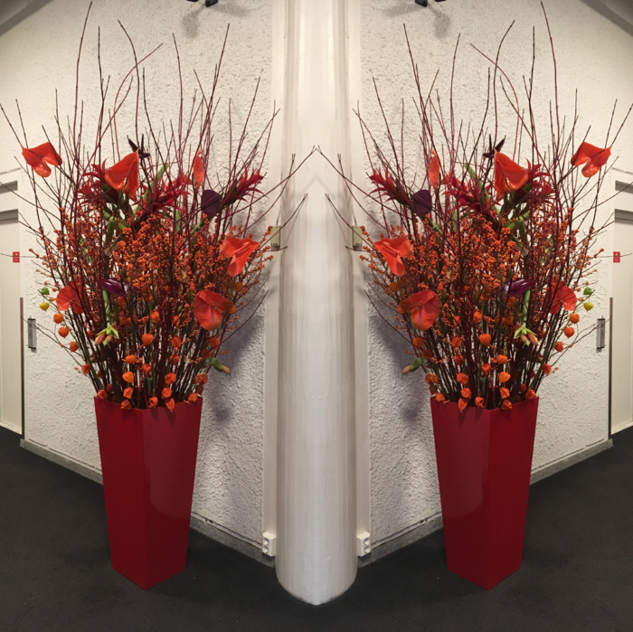 Det kan være fint å tenke på at ved bruk av en stor scene eller i et stort rom, trenger man større dekor for at blomstene skal stå i proporsjon med resten. Noen ganger kan det være bedre å lage en stor dekorasjon istedenfor to små. Dekorasjonene lager vi i en høyde som er godt synlige fra salen, men ikke skjuler de aktiviteter som foregår på scenen. Ønsker dere høyere dekor, tar vi med søyler å sette dekorasjonene på. Vi leier ut både potter og søyler som en del av vårt konsept.